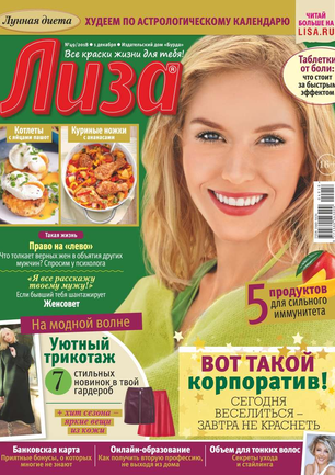 Самый популярный в России еженедельный журнал для молодых женщин «Лиза» стал еще интереснее, еще привлекательнее для читательниц. Теперь больше знаменитостей на страницах любимого журнала! Фитнес со звездой и звездный макияж, уроки стиля и самые горячие новости из жизни кумиров. А еще — модный шопинг, актуальная мода, новинки косметики и великолепные идеи для дома. Романтические истории о настоящей любви и рассказы читательниц о разных жизненных ситуациях. Аспекты психологии, секреты успешных отношений с окружающими и искусство сохранения любви.